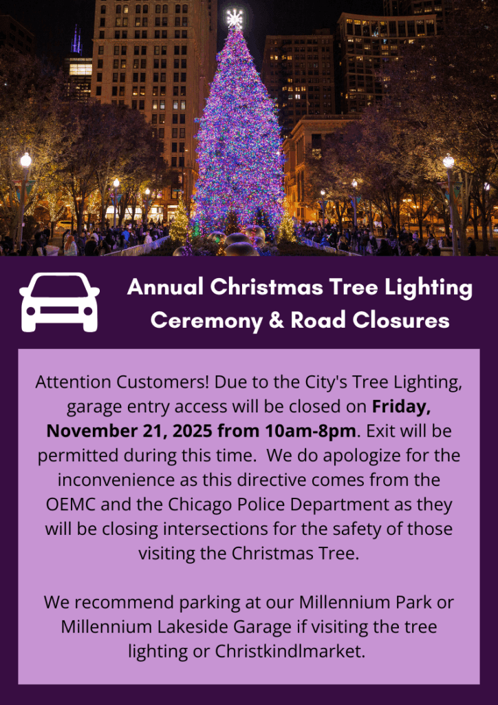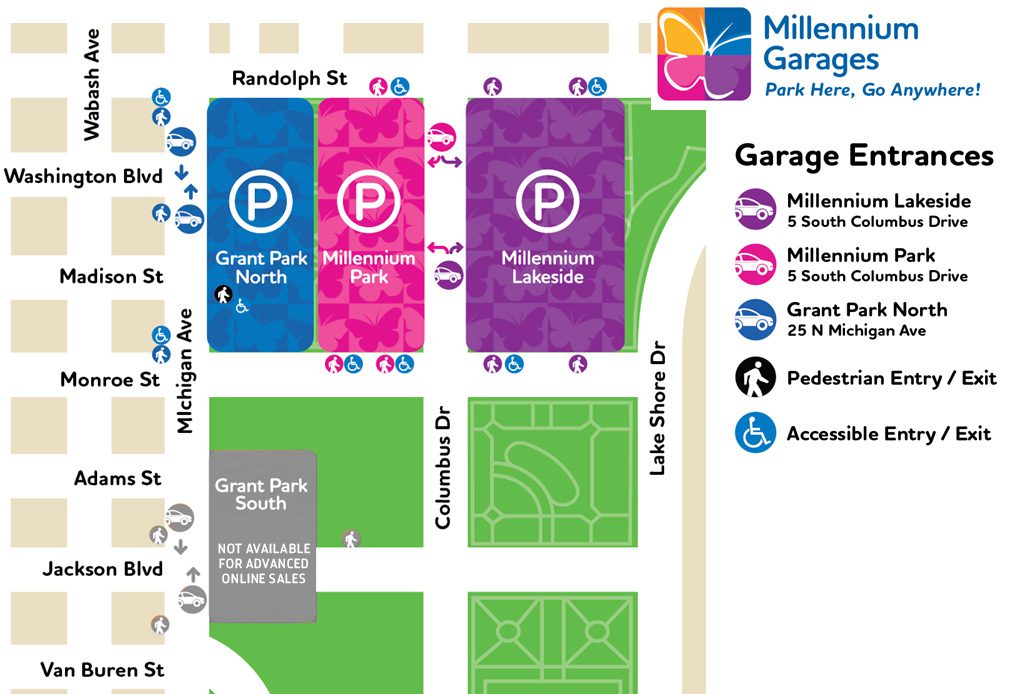 Vehicle access to these garages are located on South Columbus Drive between Randolph & Monroe. Please check for temporary road closures before you travel.