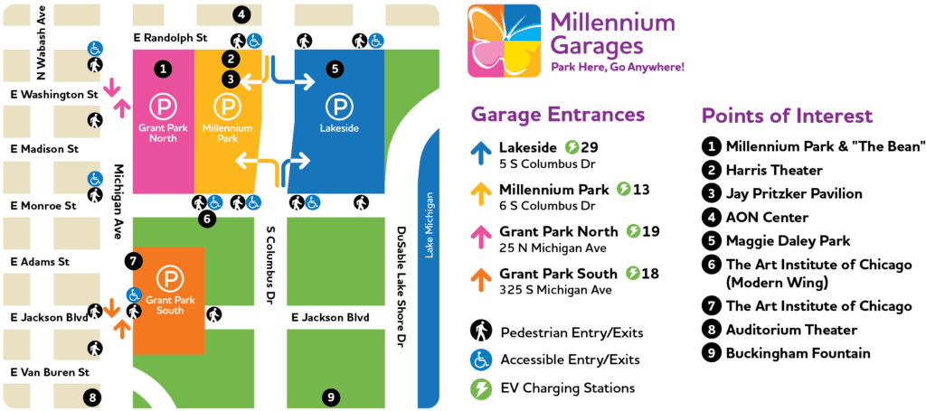 Our four Millennium Garages are located beneath Millennium Park, Jay Pritzker Pavilion, Maggie Daley Park & Grant Park.