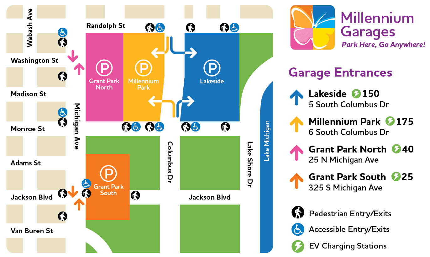 We recommend parking at our Millennium Lakeside Garage, which is located beneath Maggie Daley Park and offers direct access from the garage.