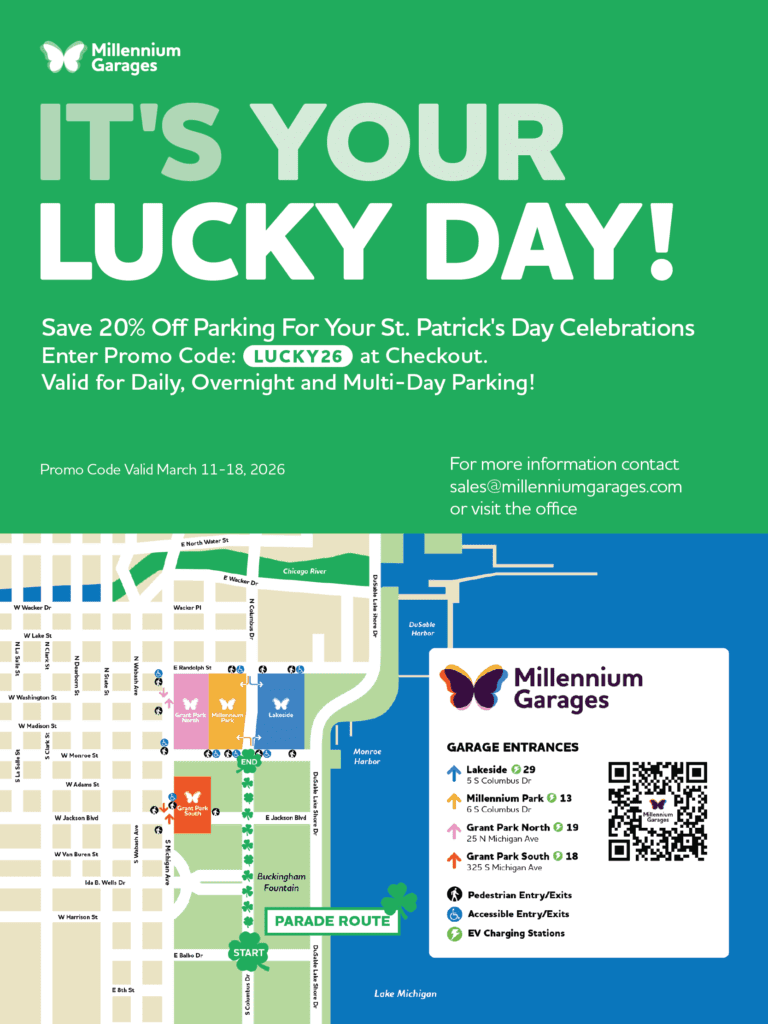 Discounted Parking for the Chicago St. Patrick’s Day Parade River Dyeing is valid at all four Millennium Garages!